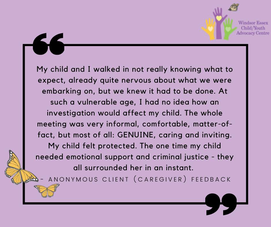 We understand the immense courage it takes for children and youth to disclose abuse. Prior to the establishment of the Windsor Essex Child/Youth Advocacy Centre children and youth often had to recount their experiences in various locations across the community, encountering different professionals at each step which increased stress and anxiety for the child/youth. Our goal is simple: to reduce the number of times a child must repeat their story. We believe kids should only have to tell their story once.